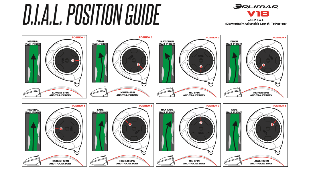 The key feature of the Orlimar V18 driver is an 8-position rotatable sole which weighs an enormous 35 grams including an offset tungsten weight. The offset tungsten weight on the sole shifts the center of gravity when rotated which alters the ball flight or what we call D.I.A.L. (Diametrically Adjustable Launch) Technology. You can increase the MOI and launch angle by rotating the red line on the dial sole to the rear, reducing spin by moving that red line to the face or create fades or draws by placing it in the toe or heel positions. In seconds, one can fine-tune the V18 dial sole to suit the player’s needs.