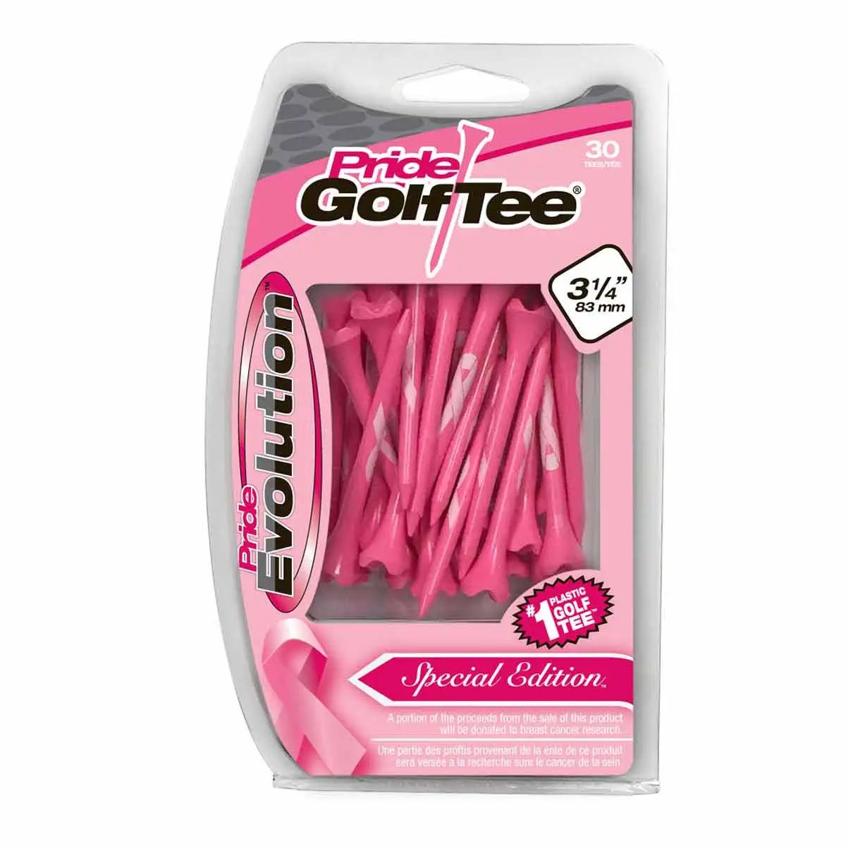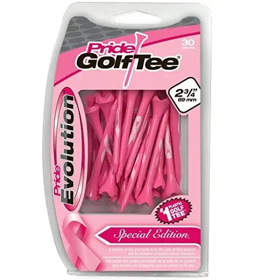 Pride Evolution is a plastic performance tee engineered with special low-resistance tips that create less friction between the golf ball and tee – resulting in longer drives. This is a special edition model in Neon Pink with an imprinted ribbon.