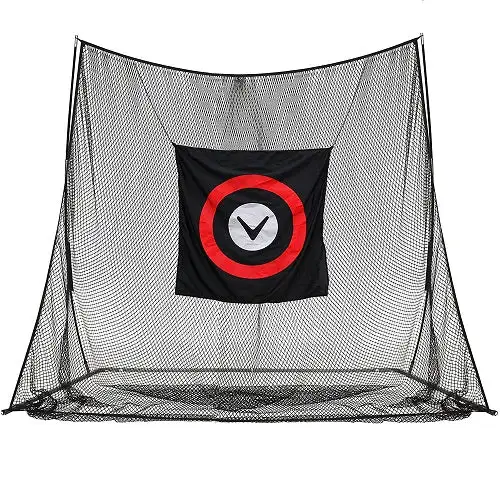 Set up your own range and practice at home with the Callaway 10′ Base Hitting Net! The large 10′ wide x 8′ high hitting area will support all your full swing training needs for every club in your bag.. The BASE Hitting Net is engineered with premium netting, reinforced fiberglass framing and a sturdy stainless steel pole base. It’s rated to catch ball speeds up to 190 mph which covers even the highest swing speeds.. The hanging target helps sharpen your focus and aim, and cradles each shot for easier ball retrieval. Assembly is fast and easy; set up and take down in 10 minutes. The net is free-standing for indoor use, and includes metal ground stakes for max stability outdoors. Use the provided nylon carry case for portability and storage.