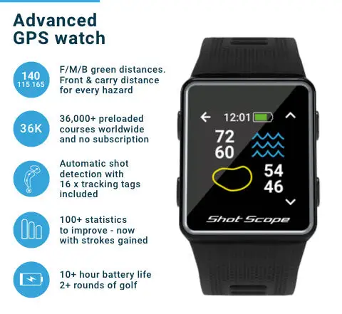 Shot Scope V3 is an advanced GPS watch with automatic shot tracking and statistics platform. F/M/B GPS distances and hazards are clearly visible on the daylight readable color screen, while the Power-Sense strap and tracking tags ensure every shot is recorded automatically while you play.