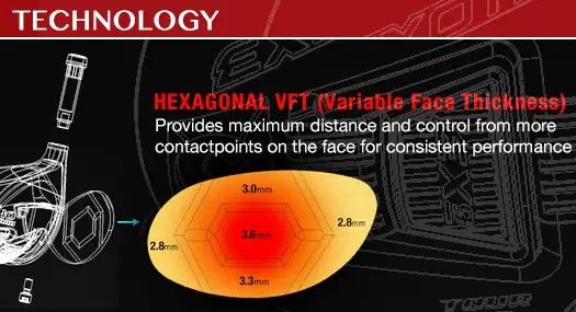 The EX9 Tour driver features a 6A4V titanium construction and a new Hexagonal variable face thickness technology. The custom Hexagonal configuration offers multiple levels of thickness for superior launch speed from more points on the face, especially in the heel and toe areas.
