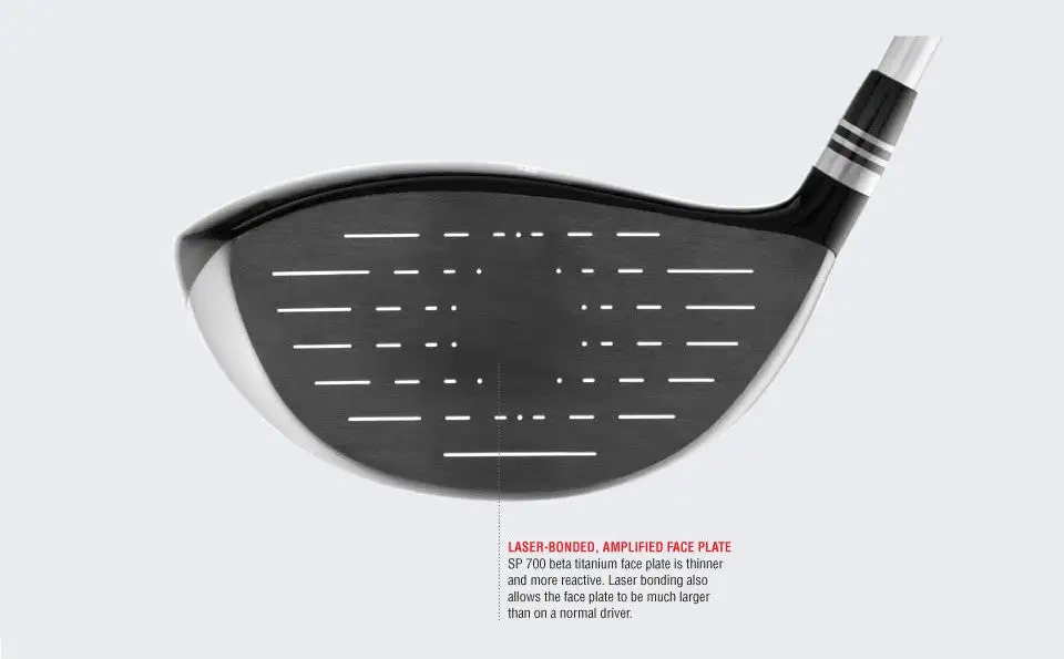 Utilizing SP 700 beta titanium in the face plate provides superior results since it is inherently thinner and more reactive. It also allows the face plate to be much larger than on a normal driver. Along with being larger, the face incorporates thinner edges allowing it to be Robotically Laser Bonded to the body. The process not only saves additional weight, it dramatically increases COR all over the face.